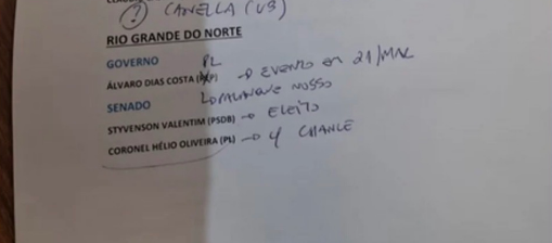 Nas anotações, também aparecem possíveis definições para a corrida ao Senado no RN, com os nomes de Styvenson Valentim (PSDB) e Coronel Hélio Oliveira (PL).