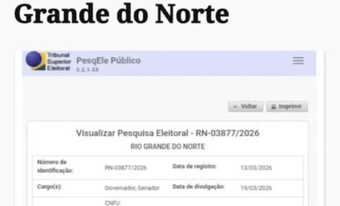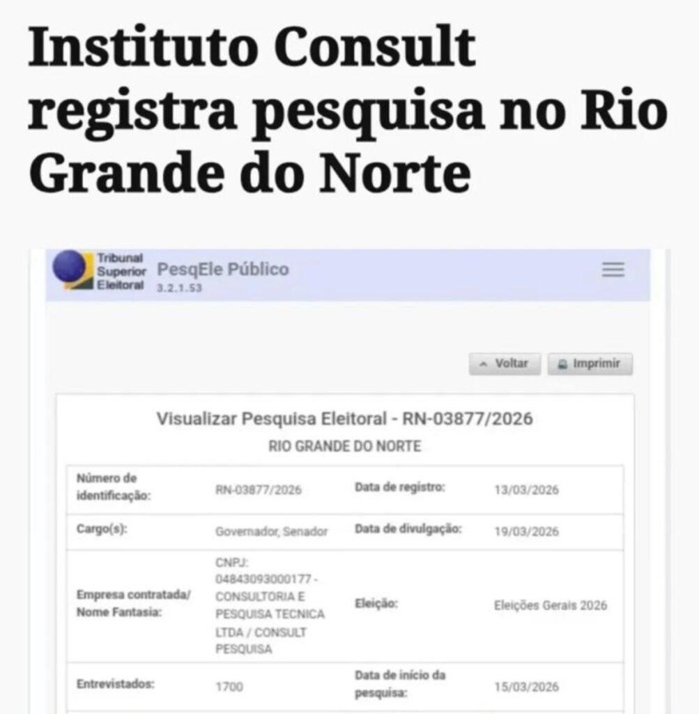 O Instituto Consult registrou nesta sexta-feira (13) uma nova pesquisa eleitoral sobre o cenário político do Rio Grande do Norte. O levantamento está cadastrado no sistema do Tribunal Superior Eleitoral (TSE) sob o número RN-03877/2026.