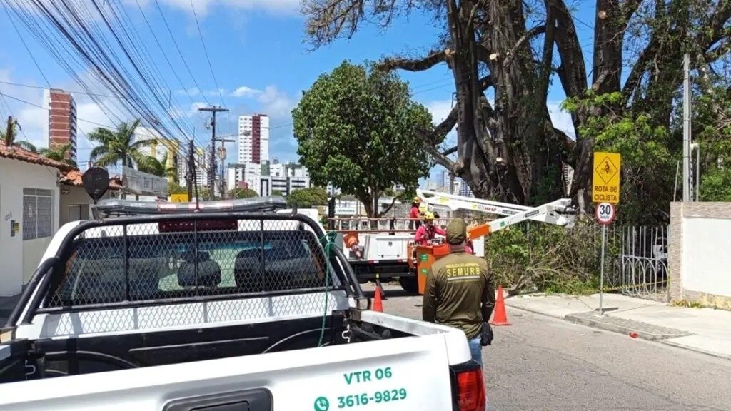 Como medida emergencial, equipes realizaram uma poda de equilíbrio, técnica utilizada para reduzir a sobrecarga sobre o tronco comprometido. O procedimento incluiu a retirada de galhos mais pesados e a reorganização da copa, com o objetivo de minimizar riscos à segurança de moradores, pedestres e edificações próximas.