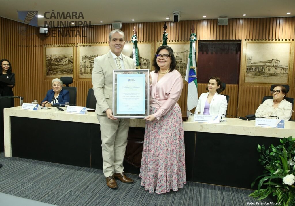 Em uma sessão solene realizada na noite desta quarta-feira (08), a Câmara Municipal de Natal concedeu o Título de Cidadã Natalense à médica Sulene Cunha Sousa Oliveira. A honraria foi proposta pela Mesa Diretora da Casa diante dos relevantes serviços prestados ao povo da capital potiguar no exercício do seu trabalho na área da medicina. O ato solene, marcado pela emoção e pelo reconhecimento, contou com a participação de autoridades, profissionais da saúde, familiares e amigos da homenageada.