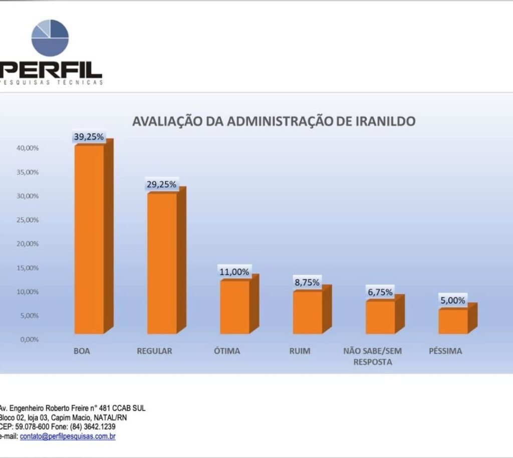 A gestão do prefeito Iranildo Aciole é avaliada de forma majoritariamente positiva pela população de Lagoa Nova, segundo pesquisa de opinião pública realizada no município nos dias 9 e 10 de dezembro de 2025.